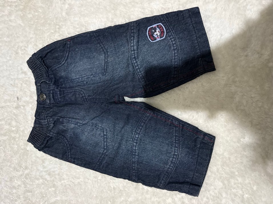 Erkek çocuklar için koyu mavi denim pantolon, düğmeli ve nakışlı detaylarla günlük sokak stili için uygun. Ürün birkaç kez kullanıldı.