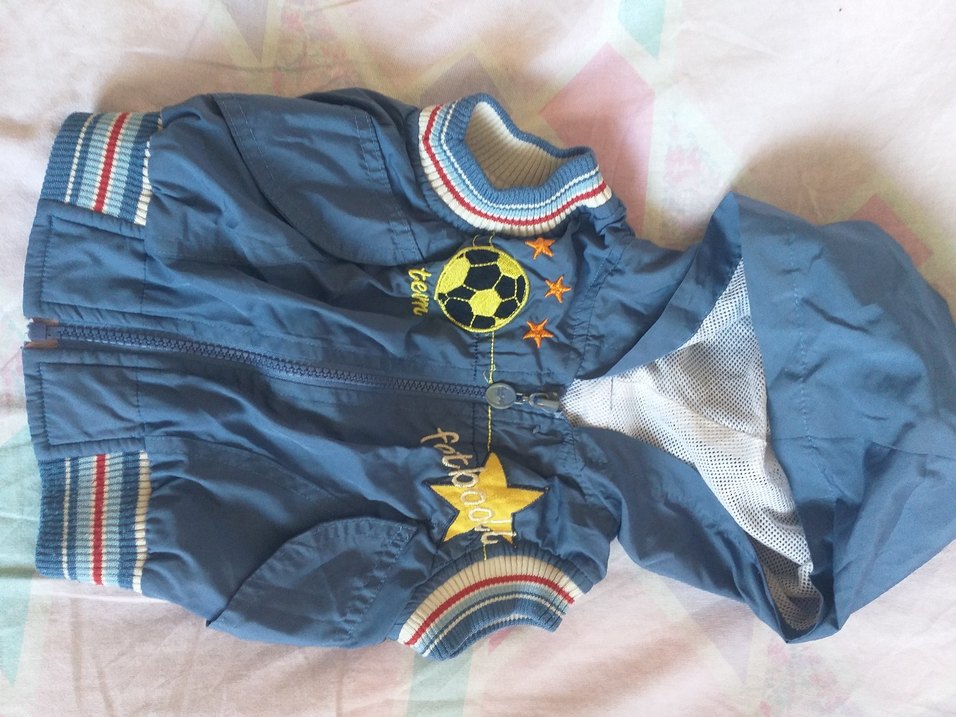 Nakışlı futbol topu ve yıldız detaylı, düğmeli, mavi renkli, dar kesim erkek çocuk ceketi. Çizgili ribanalı yaka ve street wear tarzında.iki kol arası 32 santim boy 30 santim