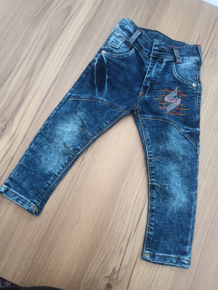 Nakışlı renkli detaylara sahip, düğmeli mavi denim erkek çocuk pantolonu, rahat kesim ve sokak stiline uygun.