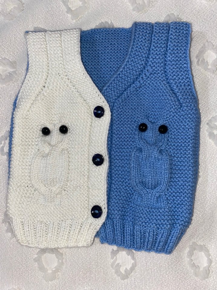 Nakışlı baykuş desenli, kolsuz örgü erkek çocuk süveterleri. Beyaz ve gri renk seçenekleri, düğmeli ve regular fit.