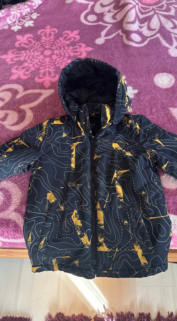 Bu erkek çocuk montu, fermuarlı ve yüksek yakalıdır. Lacivert zemin üzerine sarı desenlerle hareketlendirilmiş, yumuşak ve sıcak kumaştan üretilmiştir. Sokak modasına uygun şık bir modeldir. Kolları ekstra korumalı.10 yaş 140 cm .