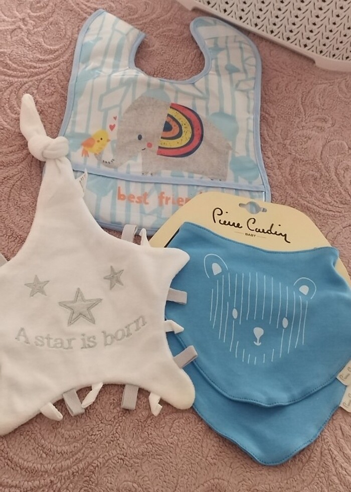 Erkek çocuk önlük yeni etiketlidir.yıldız olan emzik takılıyor.