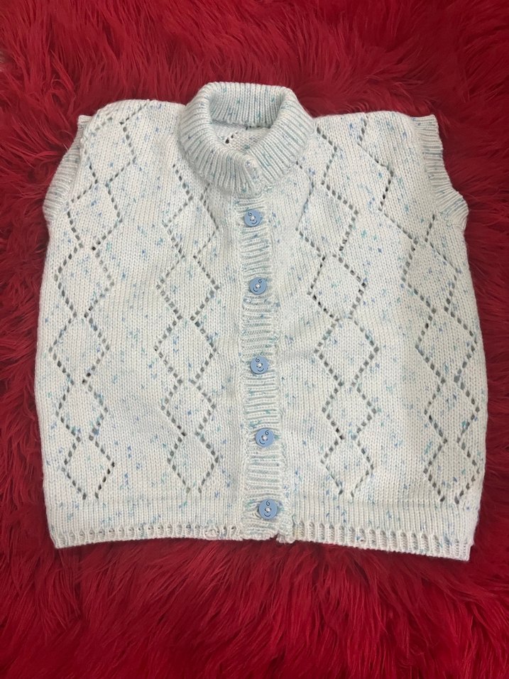 Erkek çocuklar için düğmeli, kolsuz, yuvarlak yaka ve bol kesim örgü süveter. Beyaz ve gri tonlarda hafif baklava desenlidir.