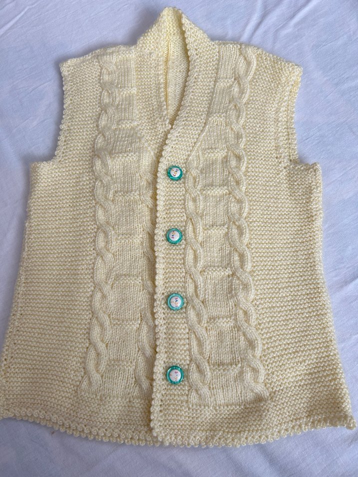 Açık krem rengi örgü erkek çocuk yeleği, V yaka ve düğmeli, rahat kesim ve yumuşak dokulu.