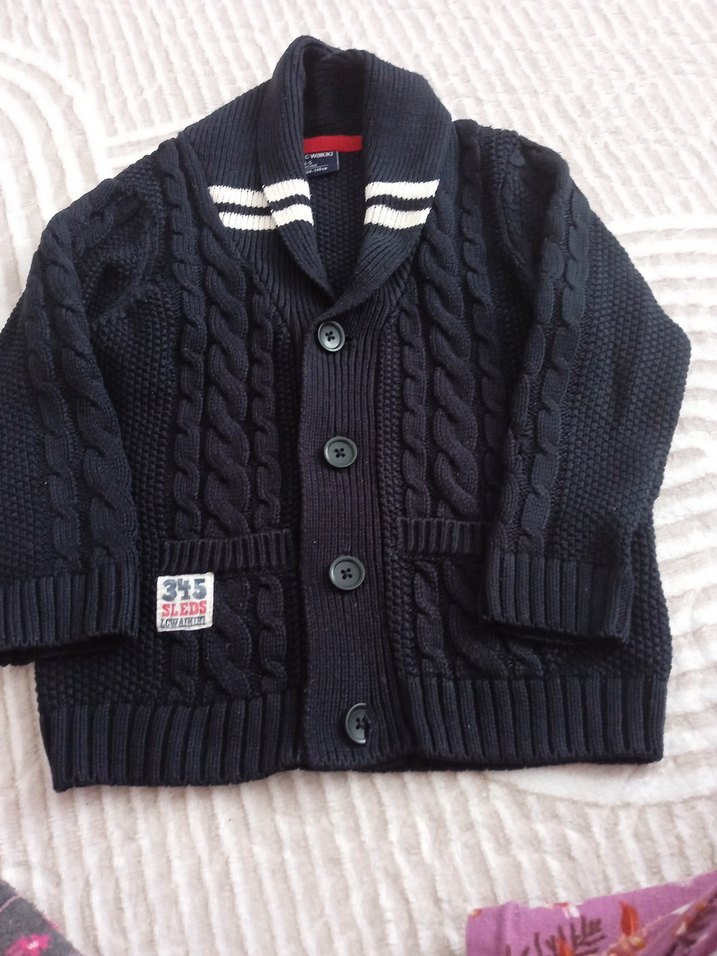 Erkek çocuk için koyu gri örgü hırka, uzun kollu ve şal yaka detaylıdır. Düğmeli ve dokulu örgü deseni vardır. Street wear tarzına uygundur.