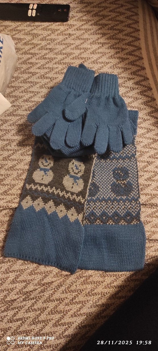 Erkek çocuklar için mavi örgü eldiven ve kar tanesi desenli atkı seti. Bohem ve retro tarzda, eldivenler desensiz, atkı desenlidir. ❄️