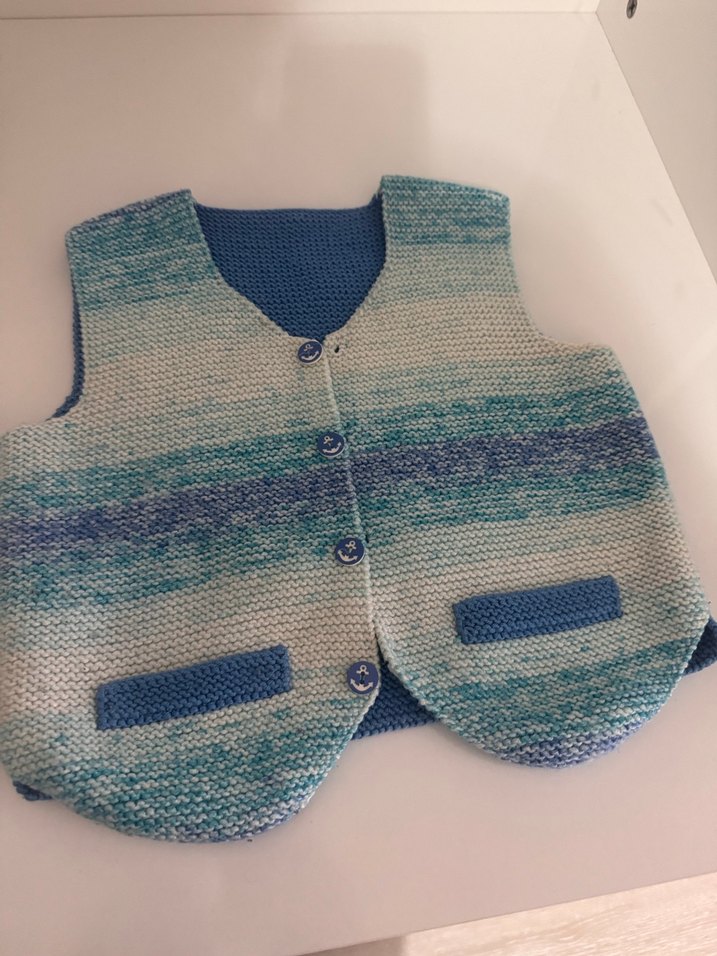 Erkek çocuk için V yaka, düğmeli, kolsuz örgü yelek. Mavi ve gri tonlarında, iki küçük ön cep bulunur.