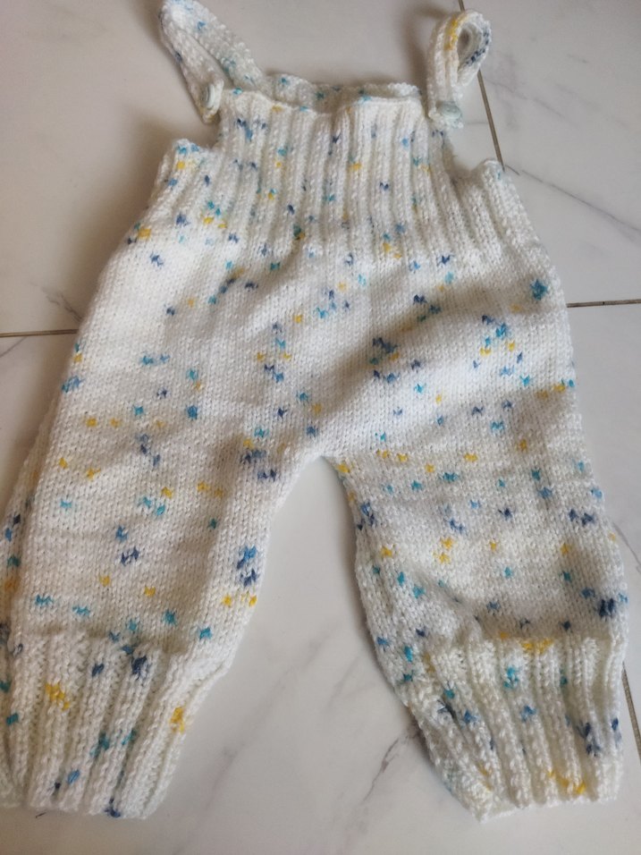 Erkek çocuklar için örgü kumaştan yapılmış, bol kesim ve kolsuz beyaz tulum. Hafif renkli detaylarla sade ve rahat bir stil sunar. el örgüsü