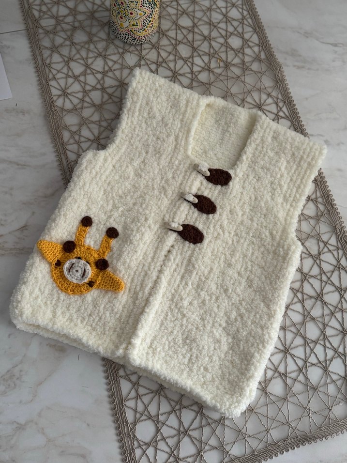 Yuvarlak yakalı, düğmeli, nakışlı zürafa detaylı erkek çocuk örgü yelek. Bohem ve retro tarzda, regular fit, kolsuz tasarım.
