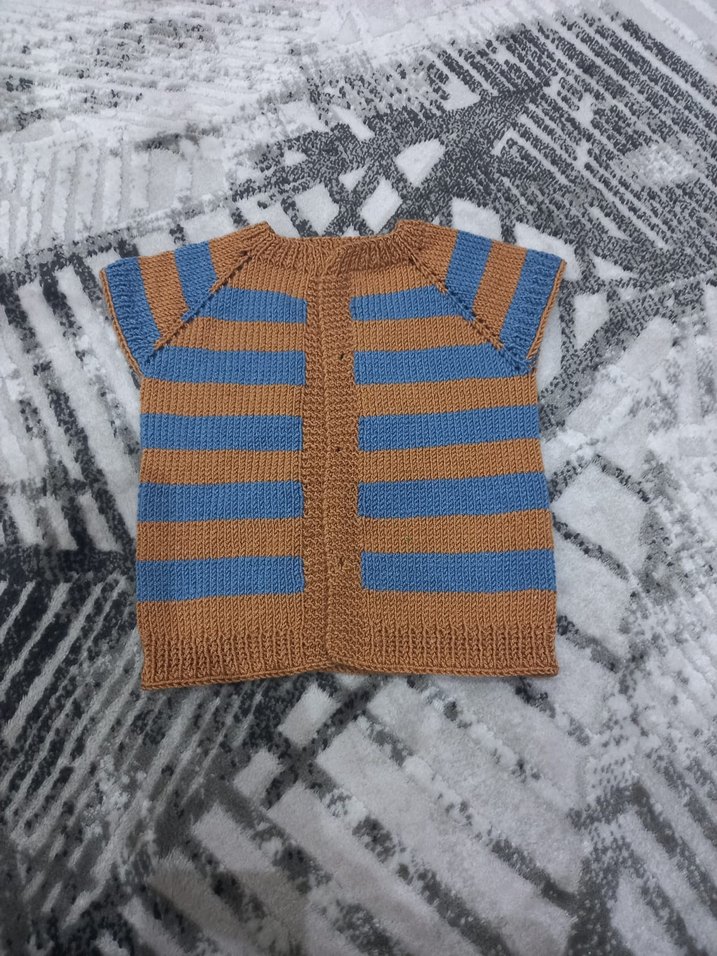 Erkek çocuklar için örgü yelek. Kahverengi ve mavi çizgili