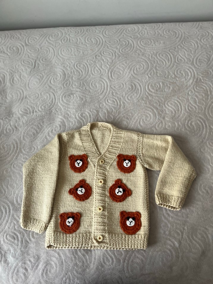 Açık kahverengi örme, uzun kollu ve ayıcık işlemeli erkek çocuk hırkası. El örgüsüdür 1 yada 2 kez ancak giyildi