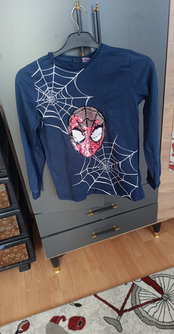 Koyu mavi, örme dokulu, uzun kollu erkek çocuk tişörtü. Örümcek Adam yüzü ve ağ baskılı, bisiklet yaka, sokak tarzı uyumlu.