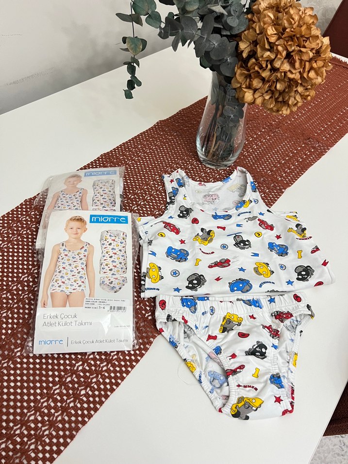 Renkli baskılı desenlere sahip, pamuklu kumaştan erkek çocuk atlet ve külot takımı.