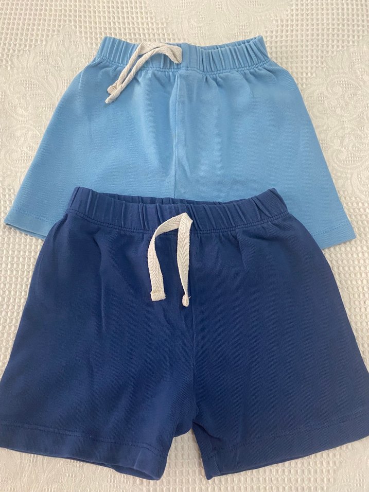 Yumuşak pamuktan, rahat kesimli, açık ve koyu mavi renklerde, ayarlanabilir bağcıklı iki adet erkek çocuk şortu.