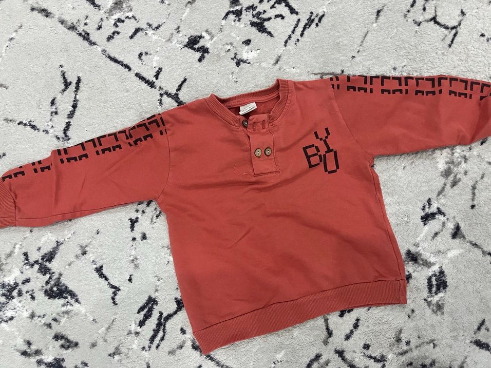 Kırmızı pamuklu erkek çocuk sweatshirt, yuvarlak yaka, uzun kollu ve düğmeli detaylıdır. Renkli baskılı, rahat kesim ve günlük sokak stili için uygundur.
