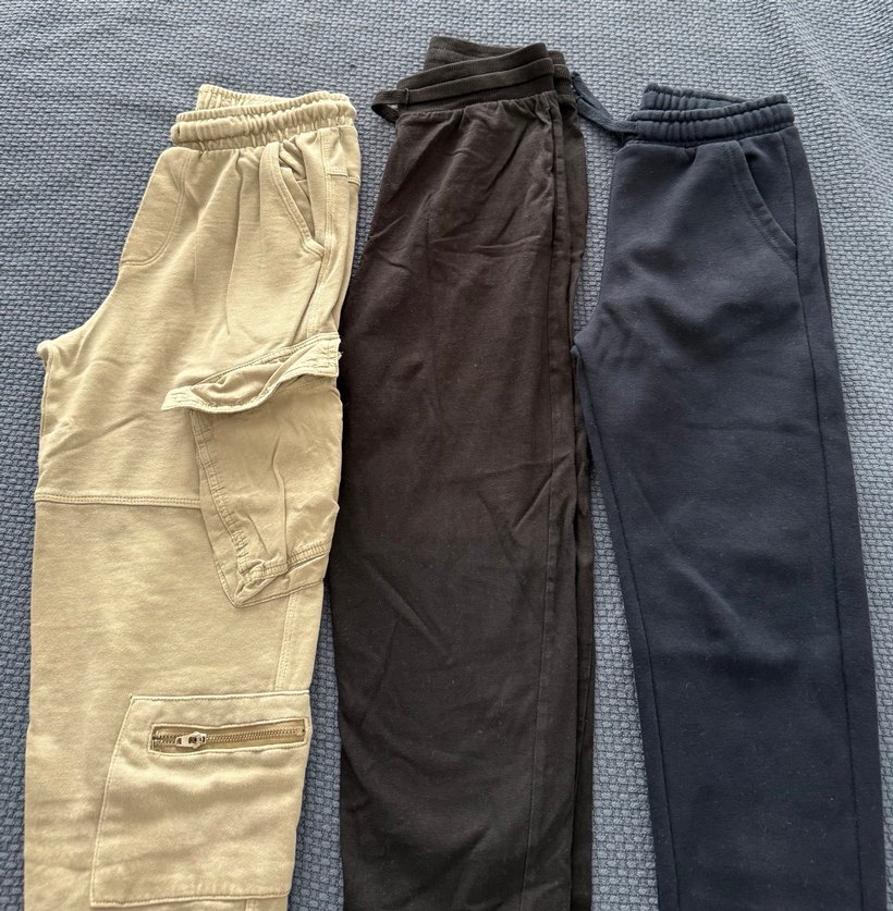 pamuklu kumaştan yapılmış erkek çocuklar için 3 tane yaş ortalama 7-8 farklı markalar Lw, Zara ve Hm ölçüler bir farklı yazılı. Zara pantolon küçük bir kusuru var fotoda belirttiğim.