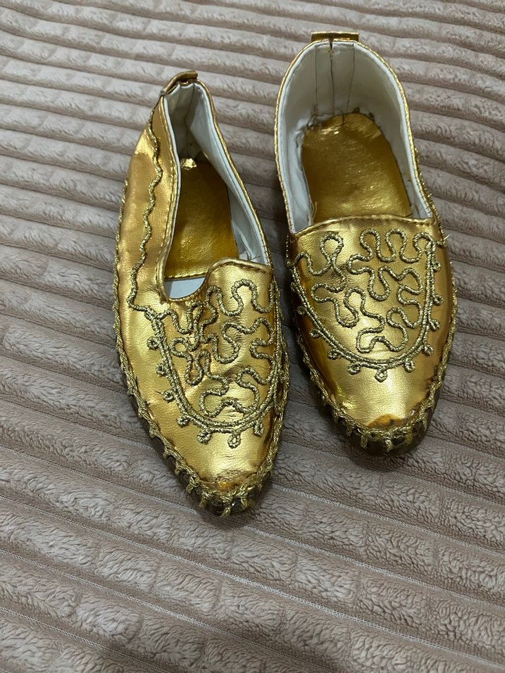 Parlak altın renkli, ipek gibi yumuşak kumaştan erkek çocuk özel ayakkabısı, işlemeli ve boncuklu detaylarla klasik bir tasarıma sahiptir. ✨