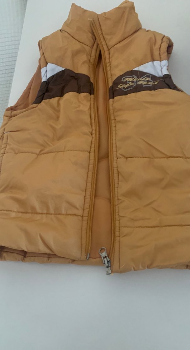 Fermuarlı, yüksek yakalı, parlak kahverengi sentetik kumaştan yapılmış, erkek çocuklar için dar kesim yelek.