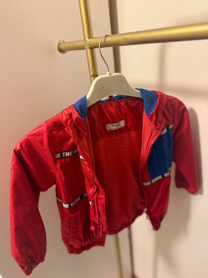 Erkek çocuklar için parlak kırmızı renkli, bol kesim streetwear tarzı yağmurluk. Notlu yakalı, cırt cırtlı ve baskılı detaylara sahip.