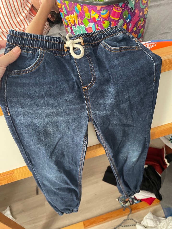 Parlak mavi renkte, tokalı ve lastikli bel detaylı, bol kesim erkek çocuk kot pantolonu. Oğlum bir kere giydi yepyenidir