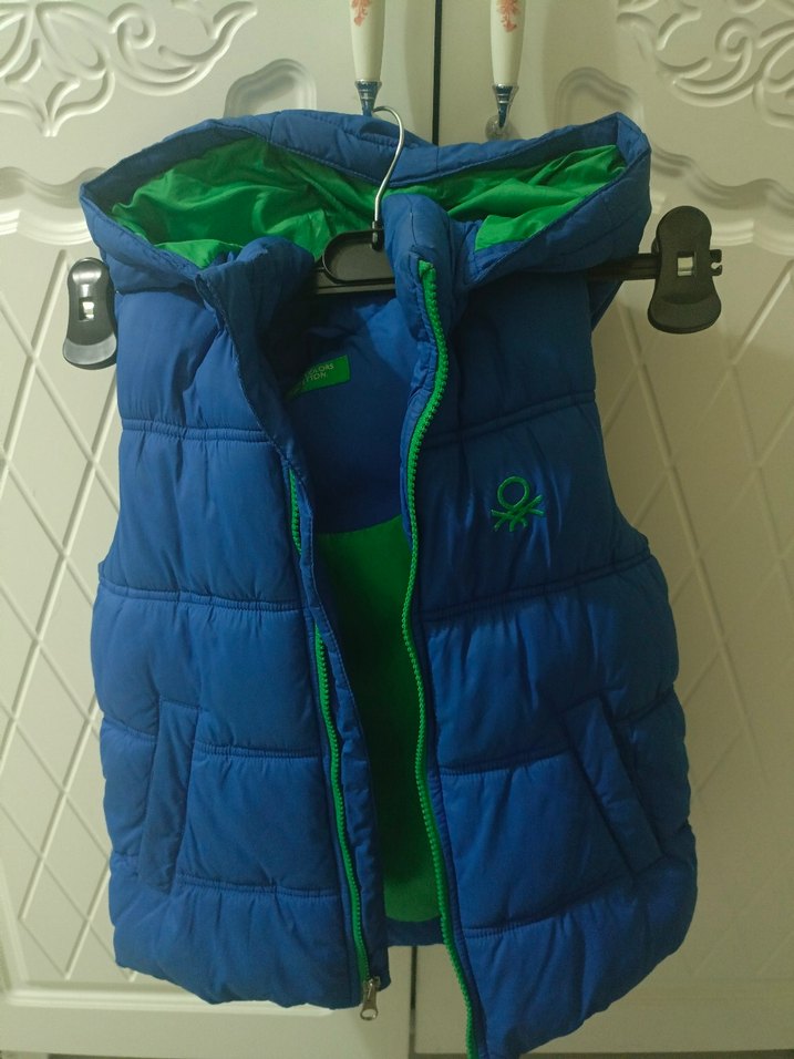 Parlak mavi dış yüzeyli, yeşil iç astarlı, fermuarlı ve yaka detaylı erkek çocuk yeleği. Sokak stiline uygun, kolsuz ve rahat kesim.