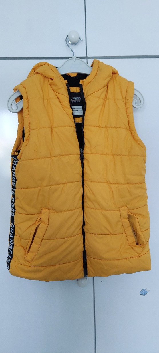 Parlak sarı renkli, kapüşonlu ve fermuarlı erkek çocuk yeleği. Yumuşak ve sıcak kumaştan, yan cepli ve sokak stilinde. Ufak bir yırtık var o sebepten fiyat uygun tutulmuştur.