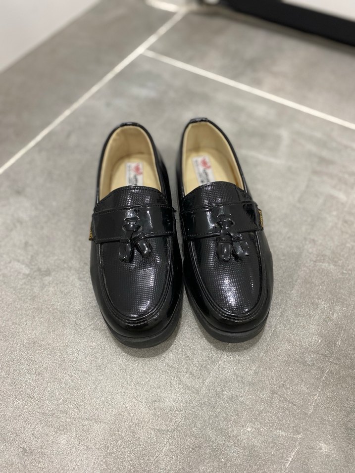 Parlak siyah, rugan erkek çocuk özel gün ayakkabısı, klasik şıklık sunar. Sadece salonda bir saat giyilmiştir. Tabanında deforme kir yoktur yada derisinde kıvrılma bile yoktur