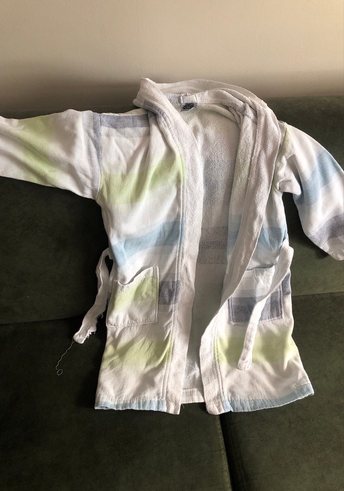 Erkek çocuklar için pastel batik desenli, yumuşak beyaz kumaştan yapılmış bornoz. Bel kuşağı ve iki ön cep bulunur. Bir balçığında sökükler var