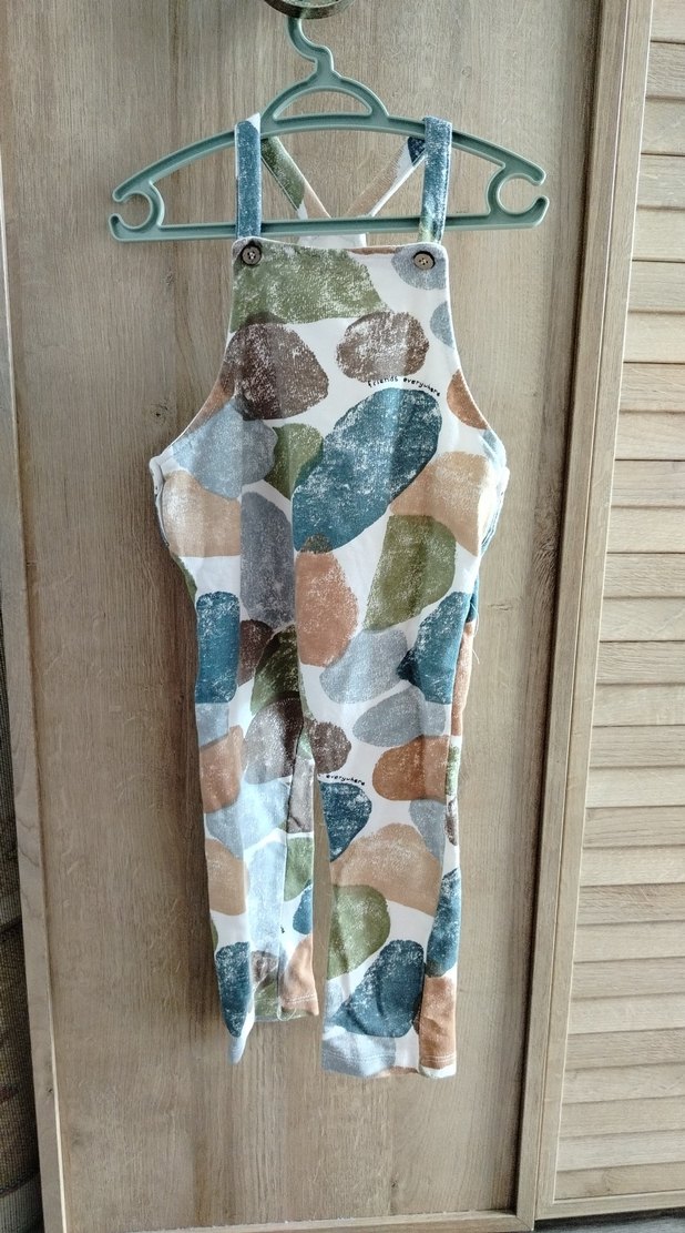 Düğmeli, kolsuz, bol kesim erkek çocuk tulumu. Pastel tie-dye desenli, yumuşak sentetik kumaştan yapılmıştır. ben kızıma giydirmisdim.