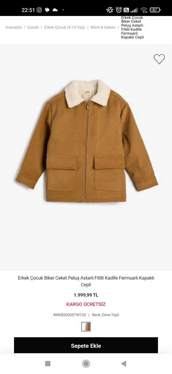 Erkek çocuk için açık kahverengi süet kumaştan yapılmış, peluş astarlı yakaya sahip ceket. Regular fit, çıtçıtlı kapaklı cepleri ve fermuarı vardır.