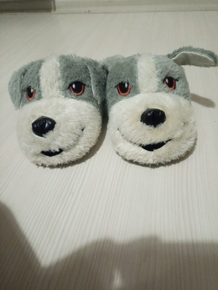 Erkek çocuklar ve kız çocuklar için gri ve beyaz tonlarında, yumuşak ve sıcak kumaştan yapılmış, köpek yüzü detaylı peluş terlikler.