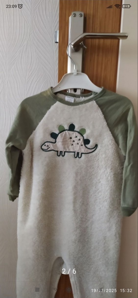 Erkek çocuklar için yuvarlak yakalı, uzun kollu ve bol kesim uyku tulumu Yumuşak peluş detaylı, nakışlı dinozor figürlü. Sokak stili için uygun, pastel gri ve yeşil renklerde.