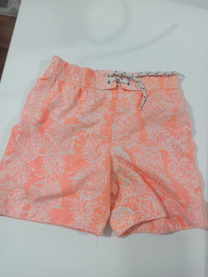 Renkli pembe, ananas desenli erkek çocuk şort mayo, lastikli bel ve bağcıklı.