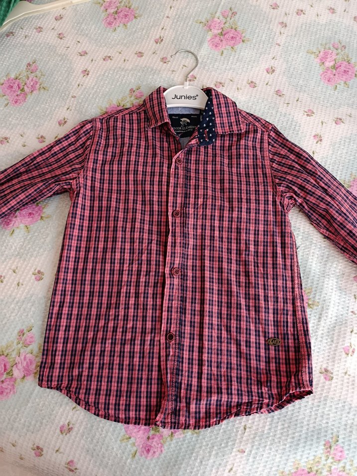 Erkek çocuklar için uzun kollu, düğmeli ve yakalı, koyu pembe kareli pamuk gömlek, rahat kesimle sunulur.
