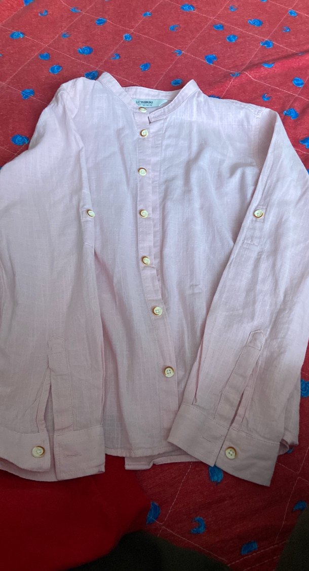 Keten kumaştan yapılmış, düğmeli, pastel pembe renkli, uzun kollu ve notched lapel yakaya sahip erkek çocuk gömleği. Rahat ve bol kesimdir.