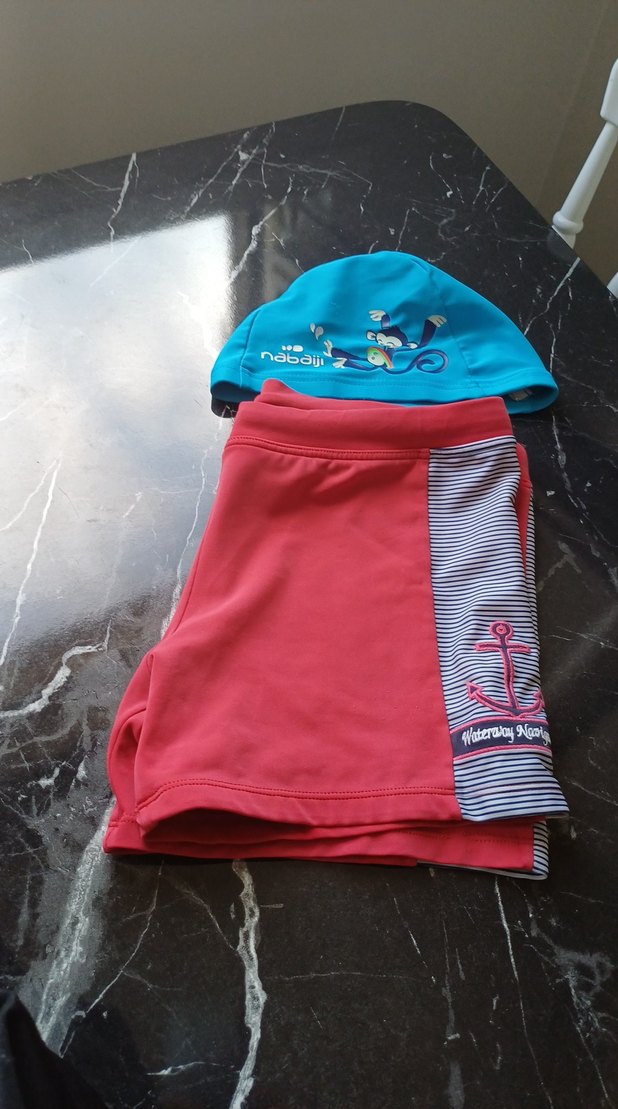 Yanları çizgili pembe yüzme şortu ve üzerinde küçük desen bulunan mavi yüzme bonesi. Erkek çocuklar için rahat ve kullanışlı yüzme kıyafetleri. 11-12 yas
