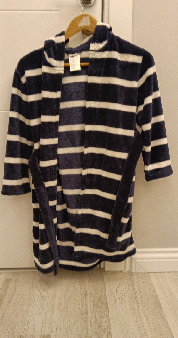 çocuk için uzun kollu, bol kesim lacivert i ve beyaz yatay çizgili rahat midi boy sabahlık ev stiliyle uyumlu.
