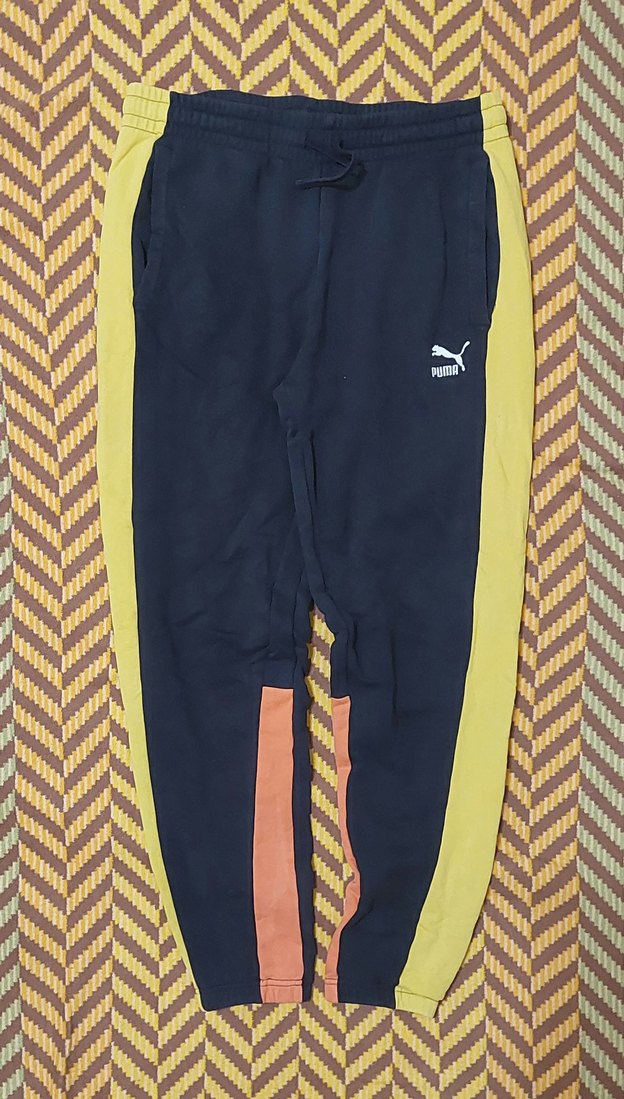 Fermuarlı cepleri ve yumuşak, sıcak kumaşıyla erkek için dar kesim eşofman altı. Siyah zemin üzerine canlı sarı ve turuncu yan şeritler ve küçük Puma logosu bulunur. ♂️ Defo yok, biraz renk solması mevcut.