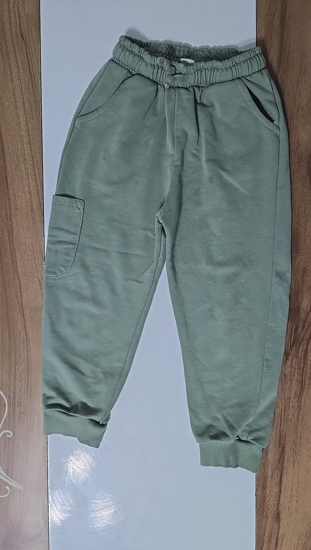 Bu haki renk erkek çocuk pantolonu, rahat kesim, lastikli bel ve paçalarla yumuşak ve sıcak kumaştan yapılmıştır. Sade ve şık tasarıma sahiptir.