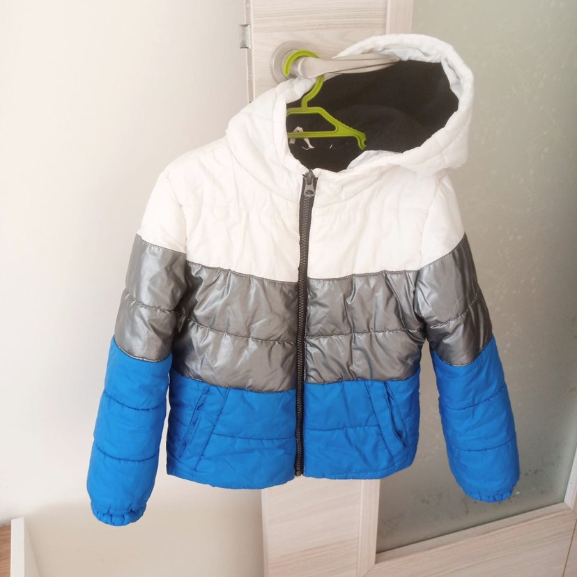 Erkek çocuk için kapüşonlu, fermuarlı ve renk bloklu mont. Beyaz, gri ve mavi renklerde, yumuşak ve sıcak dokulu kumaştan üretilmiştir.