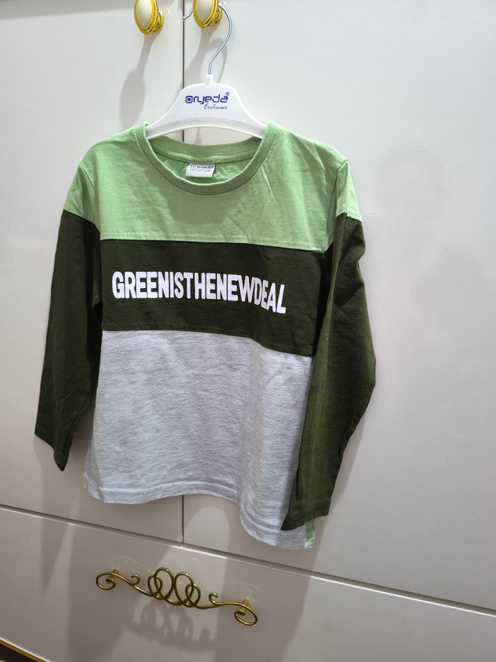 Erkek çocuk için uzun kollu, yuvarlak yaka, bol kesim sweat. Yeşil, gri ve koyu yeşil renk bloklu, örgü dokulu sentetik kumaştan, önünde "GREENISTHENEWDEAL" baskılı.