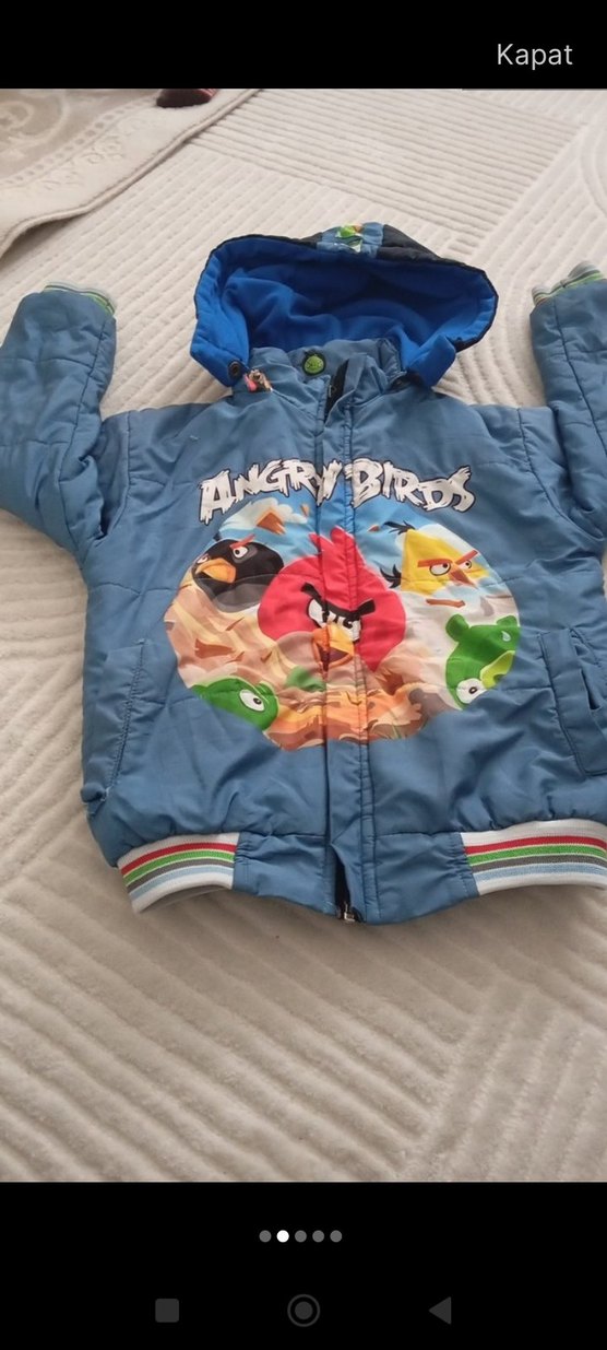 Mavi renkli, kapüşonlu ve fermuarlı, önünde renkli Angry Birds baskısı olan fit kesim mont. Yumuşak ve sıcak kumaştan, sokak stiline uygun. 5. ile 6 yaşa olur