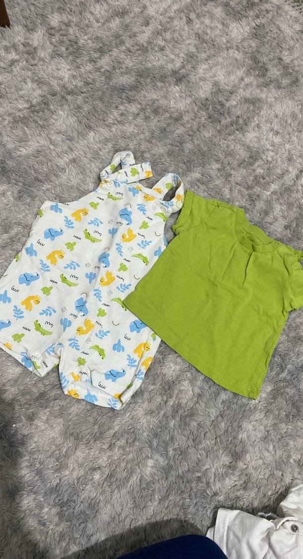 Renkli hayvan desenli askılı erkek çocuk tulumu, yeşil bol kesim tişörtle birlikte. Yumuşak, örme kumaştan yapılmıştır.