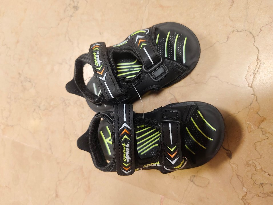 Erkek çocuklar için siyah kauçuk malzemeden, renkli baskılı ve cırtcırtlı ayarlanabilir bantlara sahip terlik. Trendy gündelik sokak stili için uygun.