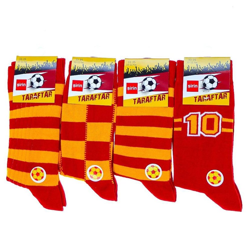 Kırmızı ve sarı renklerde baskılı, futbol temalı desenlere sahip renkli erkek çocuk çorapları. Rahat ve canlı tasarım. ⚽