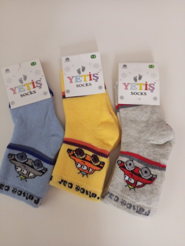 Erkek çocuklar için araba desenli, yumuşak kumaştan yapılmış renkli baskılı havlu çorap seti. Mavi, sarı ve gri renklerde üç çift.