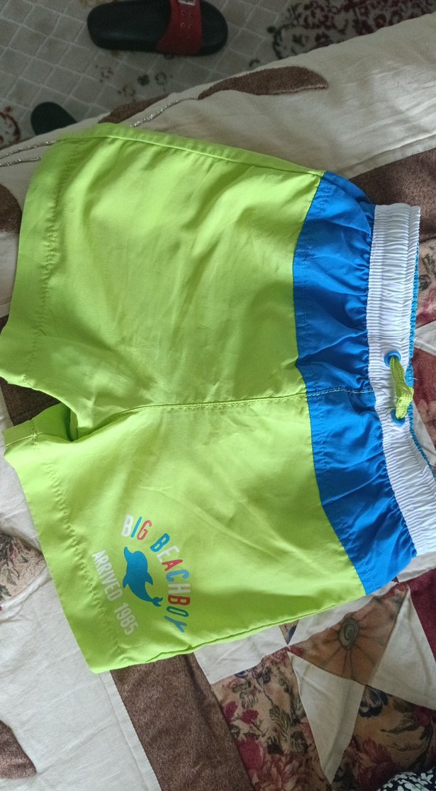Erkek çocuk için yeşil ve mavi renklerde, baskılı desenli ve lastikli bel bantlı renkli deniz şortu.