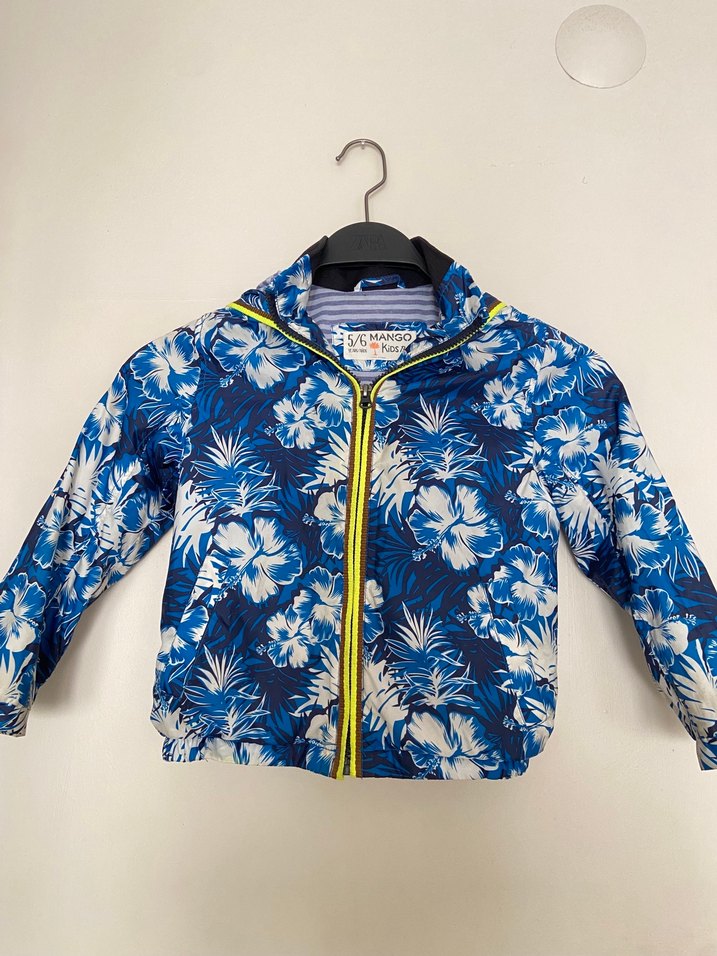 Fermuarlı önü, çentikli yaka ve renkli mavi tie-dye çiçek desenli, sentetik kumaştan yapılmış erkek çocuk için dar kesim yağmurluk. 5-6 yas