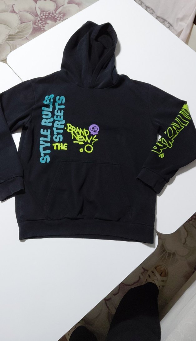 Siyah, uzun kollu, kapüşonlu erkek çocuk sweatshirtü. Renkli baskılar ve fermuar detayıyla sentetik kumaştan, rahat ve salaş kesim.