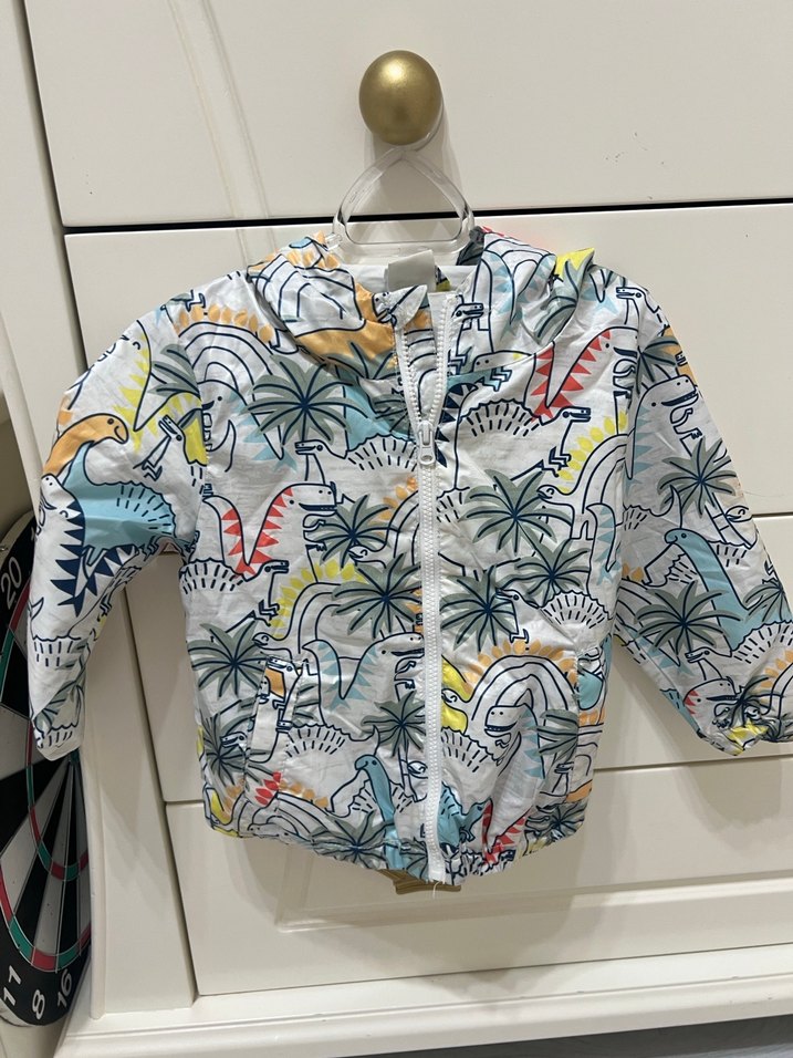 Erkek çocuk için renkli dinozor baskılı, hafif sentetik kumaştan kapüşonlu, fermuarlı ve bol kesim yağmurluk. Her️hangi bir defosu yok